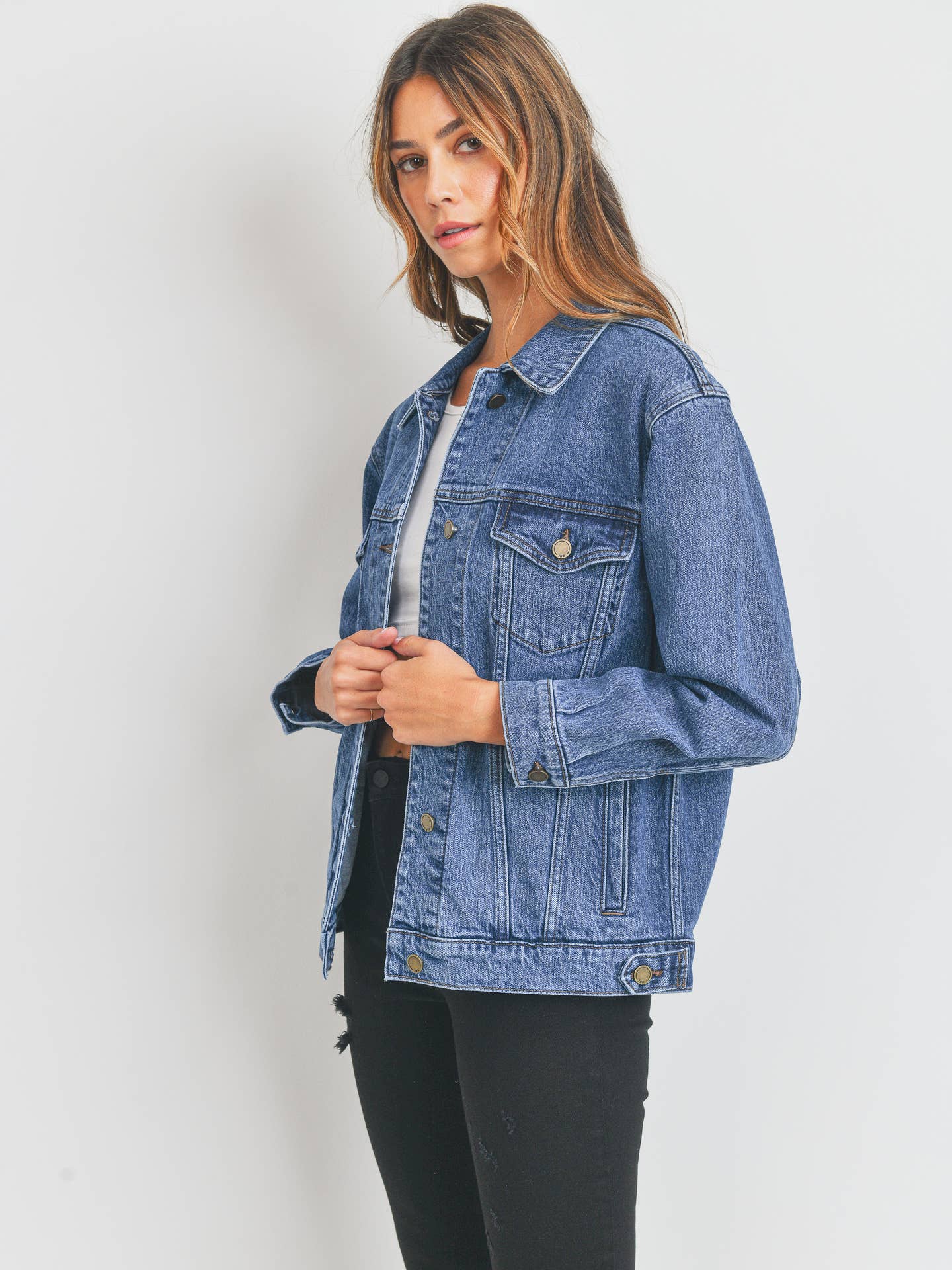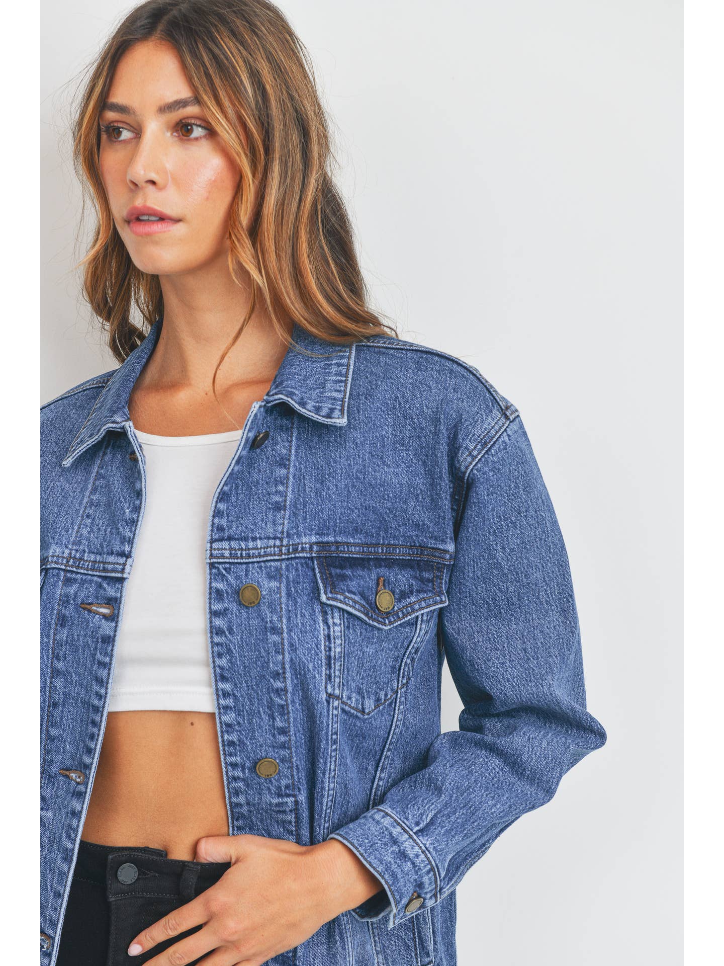 Margot Oversize Jacket Cozy up for fall in this vintage-inspired oversize jacket. Featuring a slightly worn feel, this jacket comes in washed black and dark denim. 19.5" CF Dark Denim - Oversized Denim Jacket