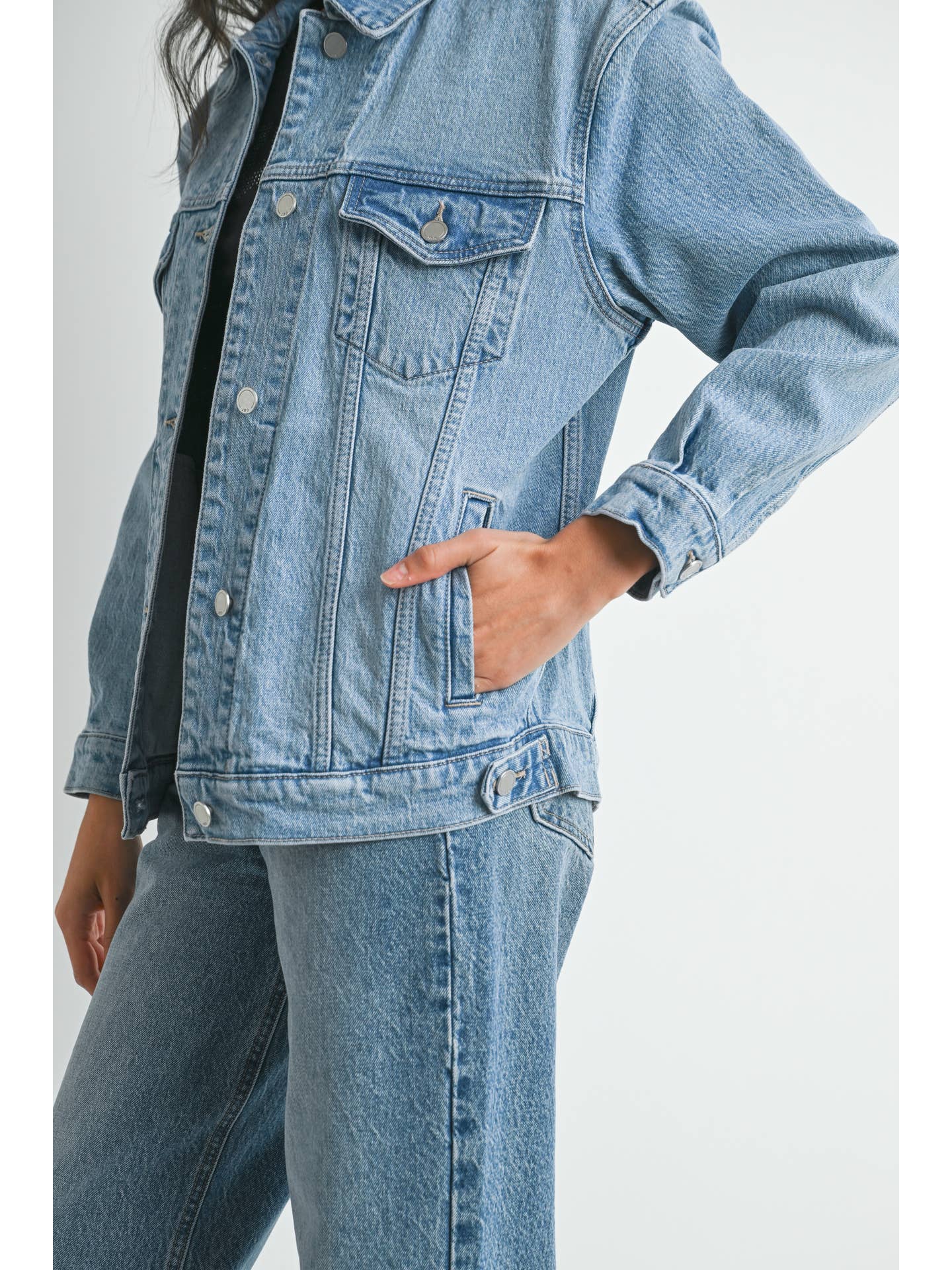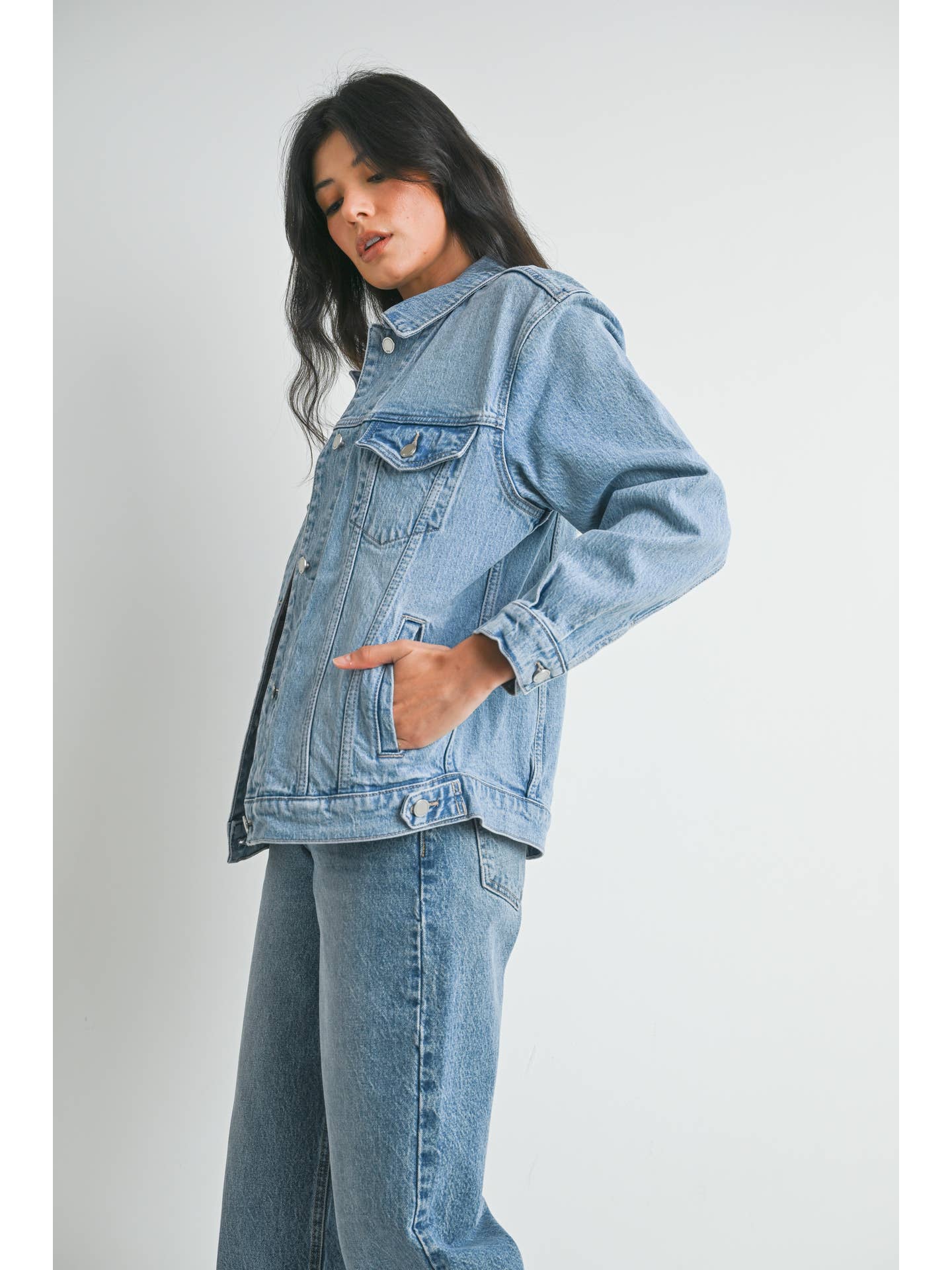 Margot Oversize Jacket Cozy up for fall in this vintage-inspired oversize jacket. Featuring a slightly worn feel, this jacket comes in washed black, medium denim, and dark denim.