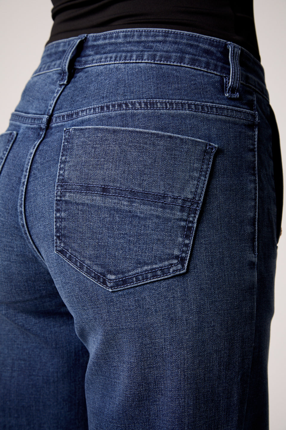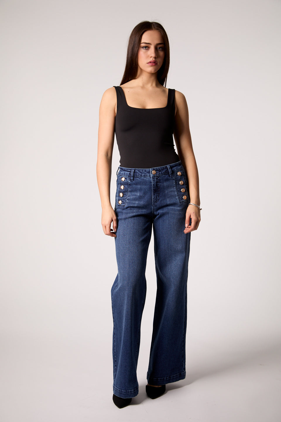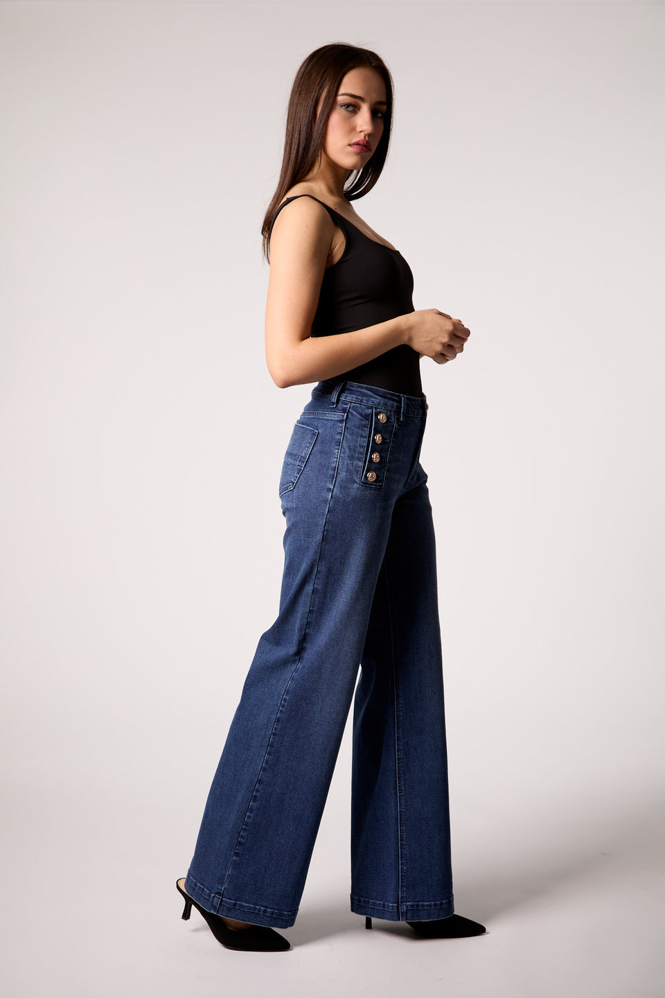 The Sailor Mid Rise Wide Leg offers a flattering mid-rise fit and a modern wide-leg silhouette. Detailed with silver sailor-style buttons, it adds just the right amount of flair without overpowering the clean design.