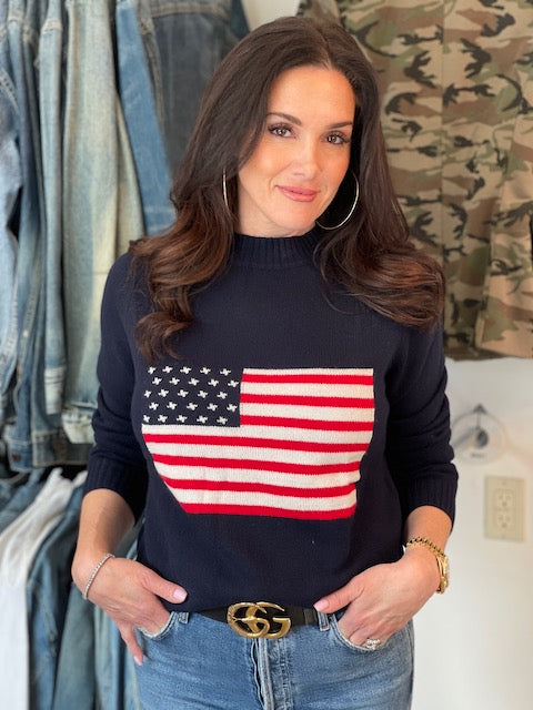 The Patriot Cashmere Sweater featuring an American Flag across the front.