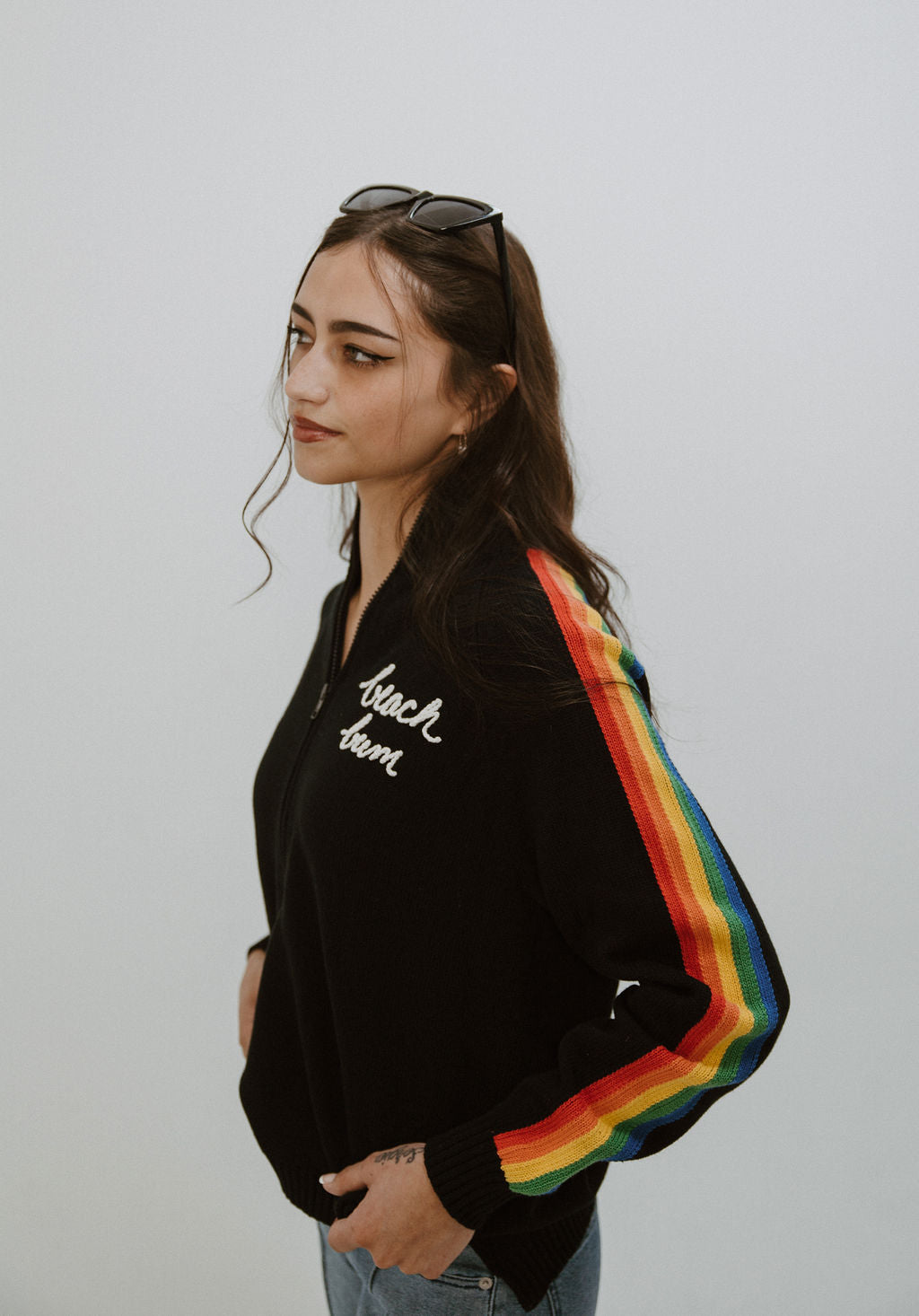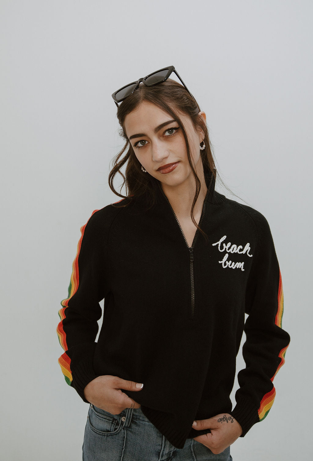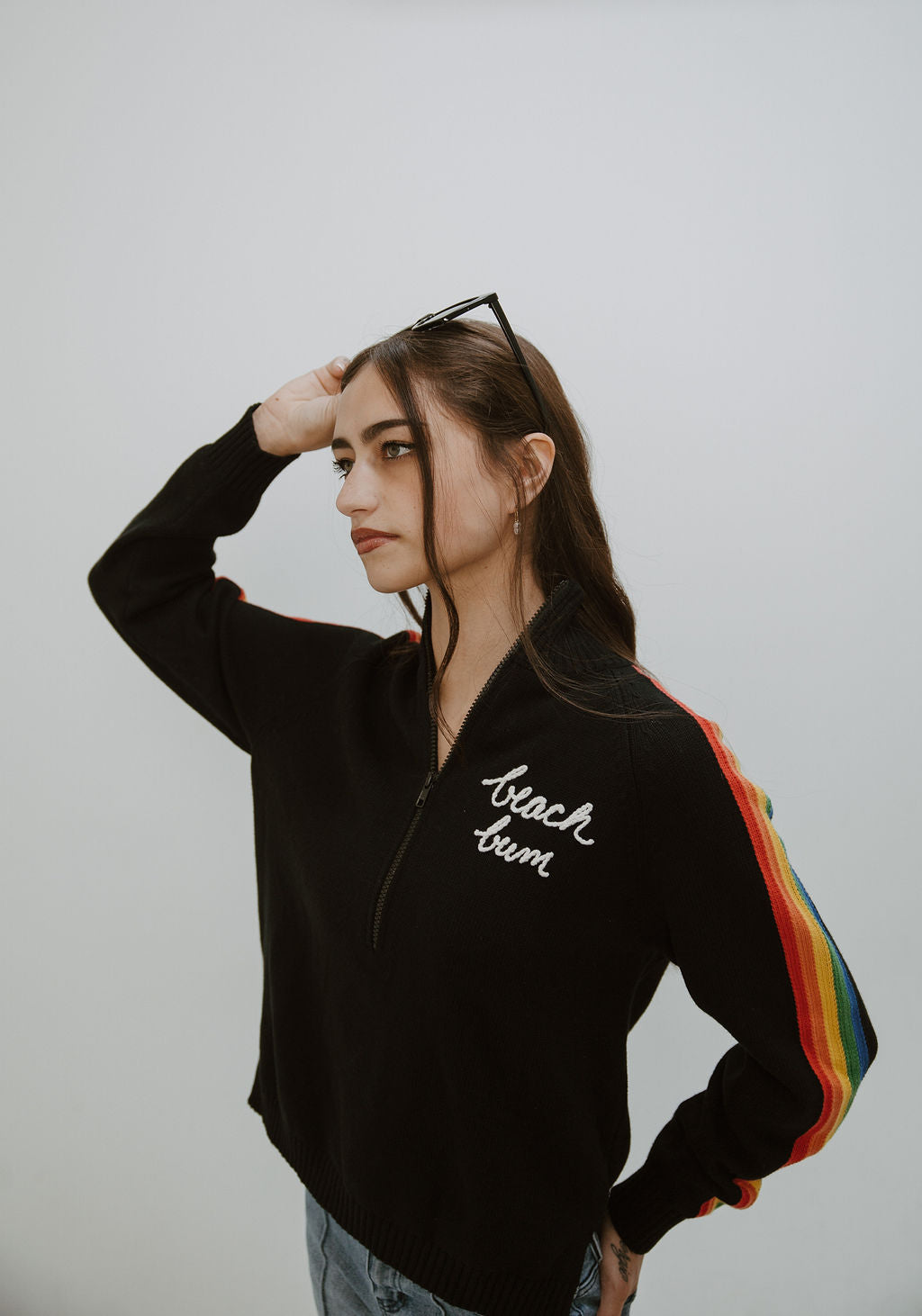 Hit the beach with this adorable 100% cotton, half zip pull over sweater! With the stripes on the arm and change stitch it embroidery, you will elevate your beach style from good , to gorgeous!
