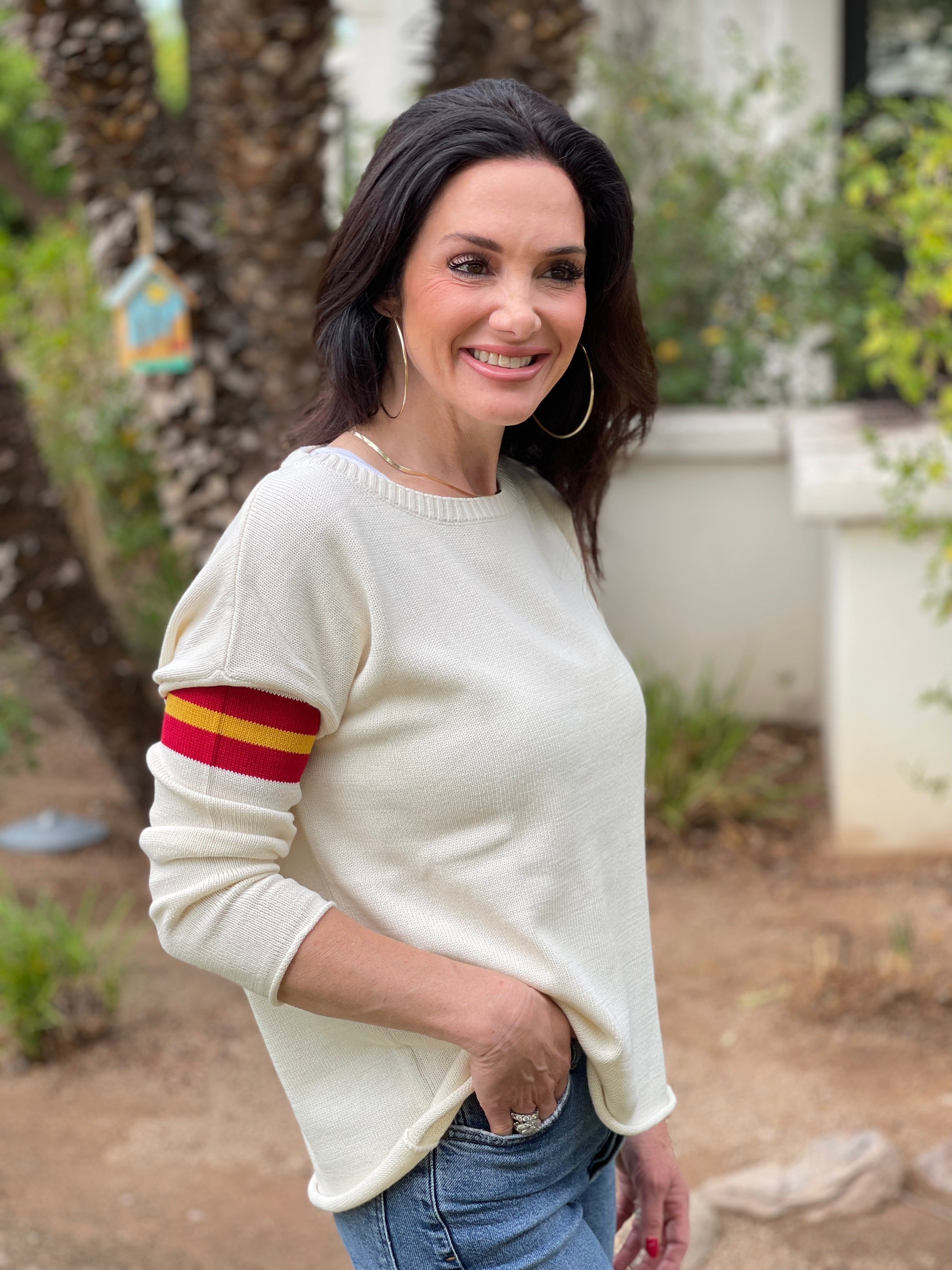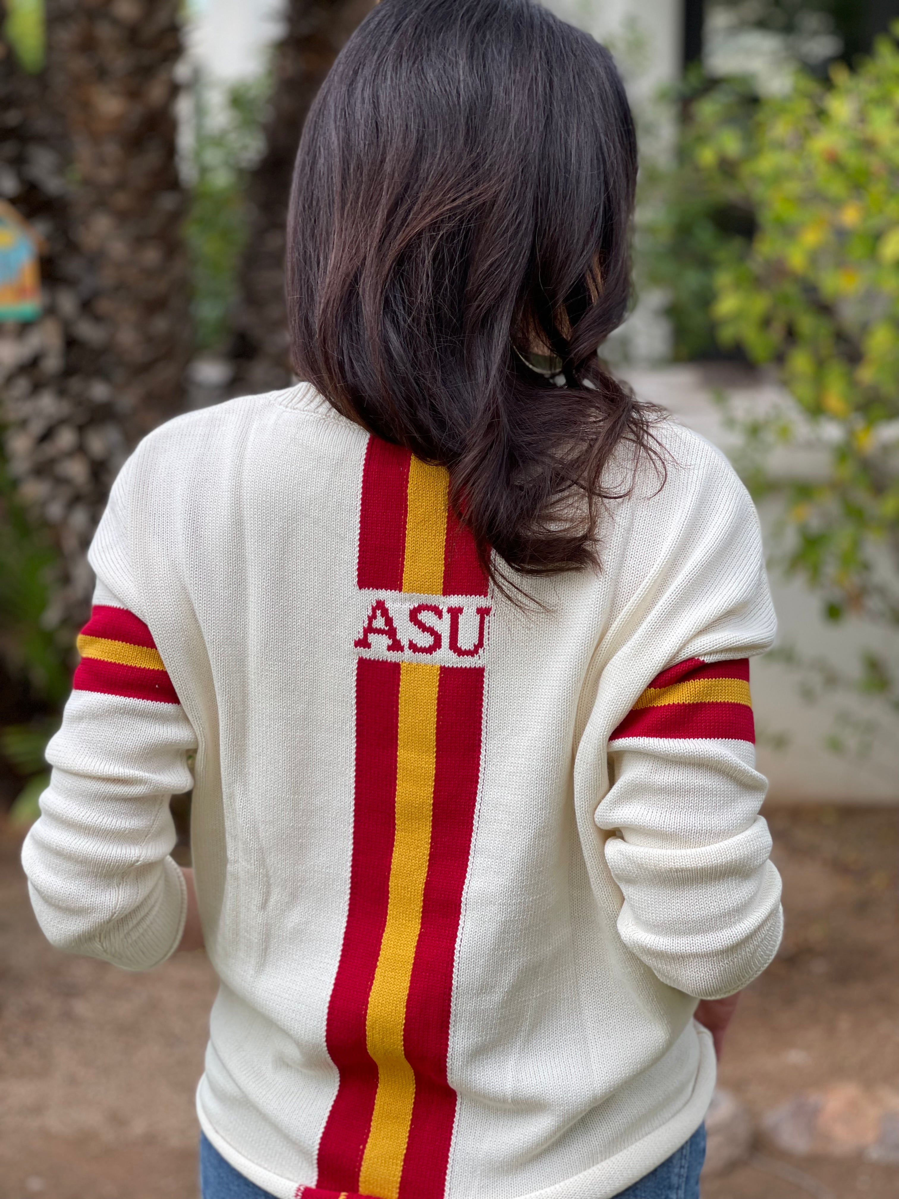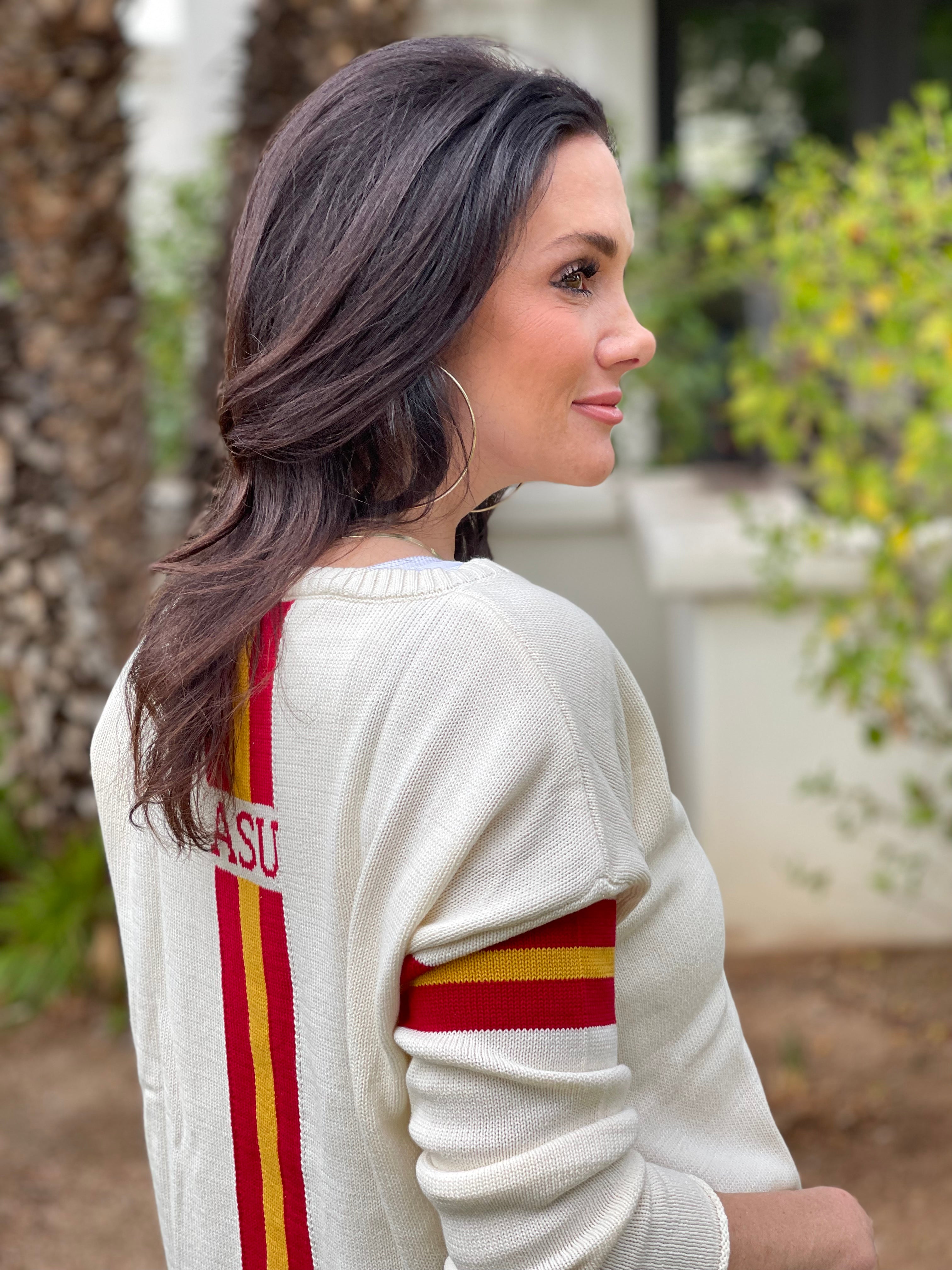 Show your ASU school spirit with this 100% cotton, lightweight boxy sweater with rugby stripes on the arms. From Homecoming to Graduation, we’ve got you covered!