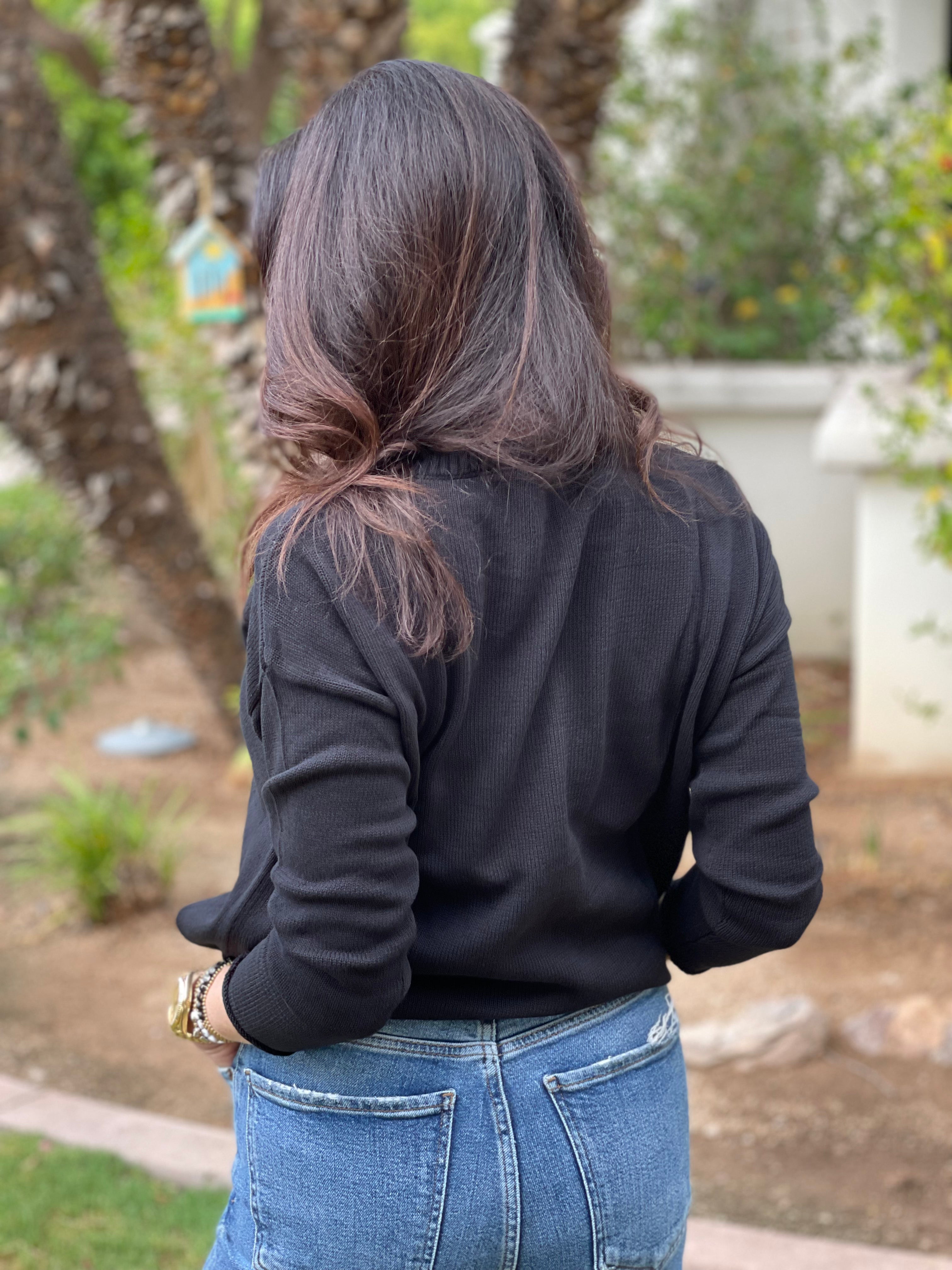 Oversized fit, size down recommended. The model is 5’5” and wearing an XS.