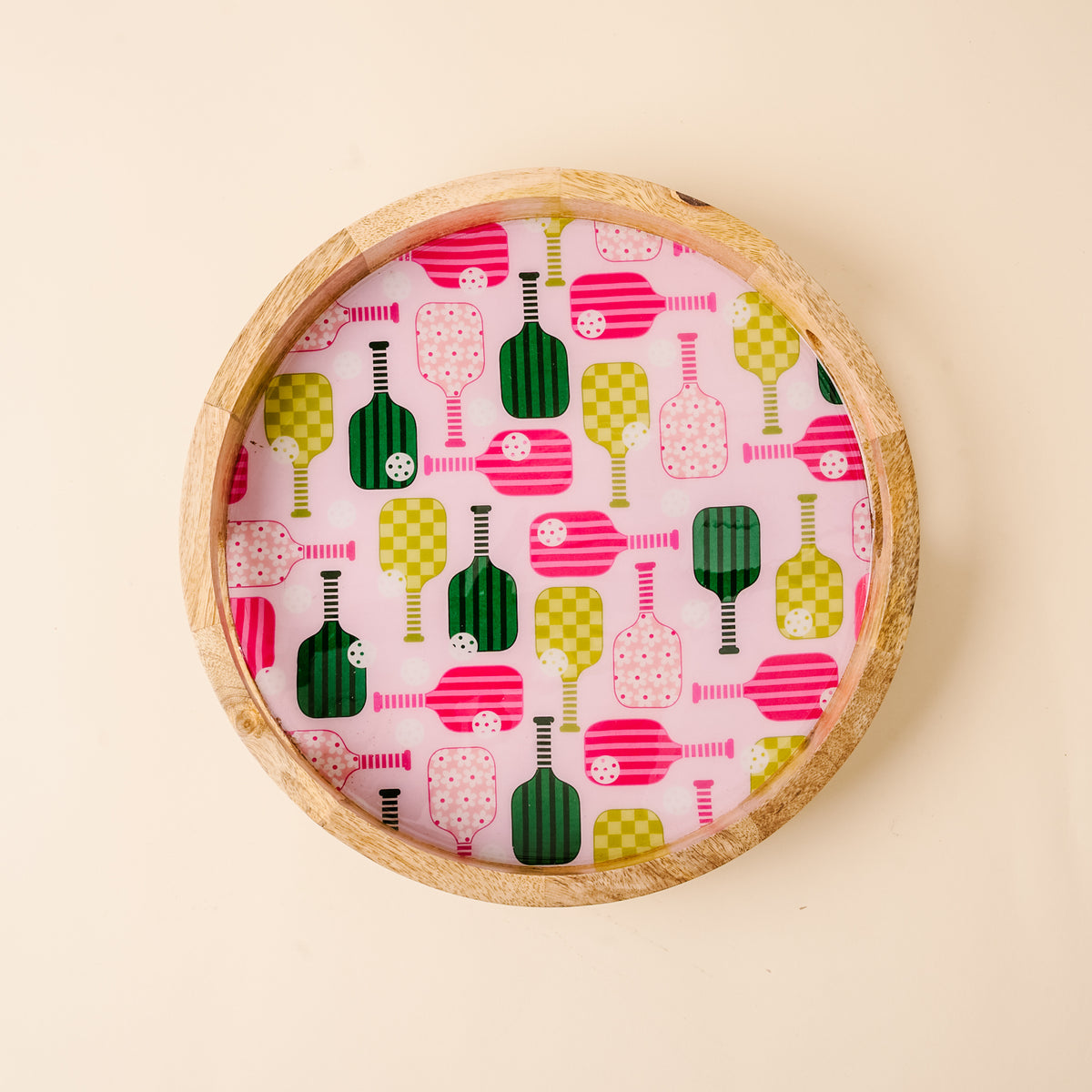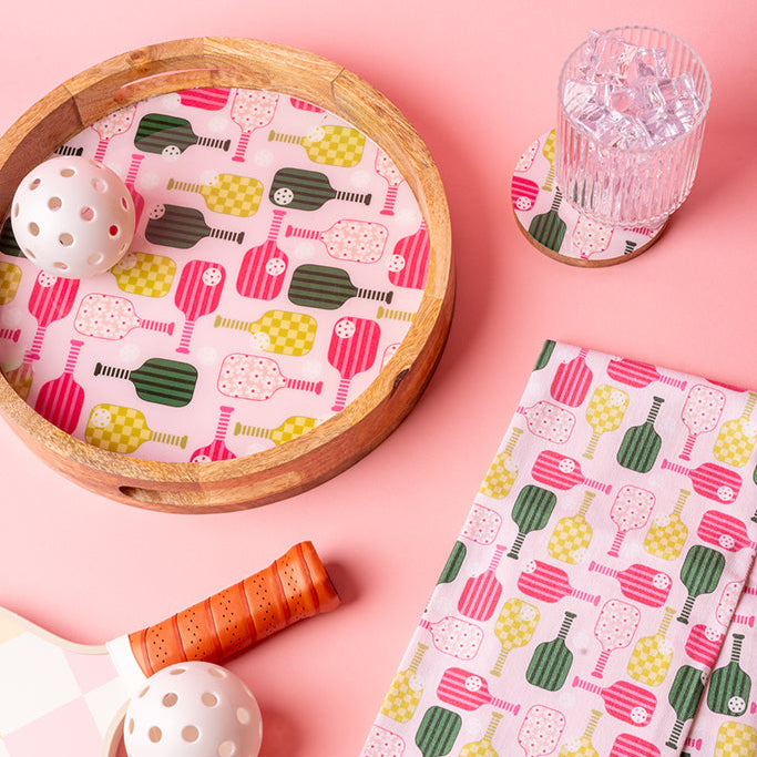 Add a touch of charm and practicality to your space with our Pickleball Party round wood enamel tray. Crafted from durable bamboo, this tray features handles for easy transport, making it perfect for serving, organizing, or displaying. Lightweight, portable, and food-safe, it’s handcrafted and has a surface that wipes clean for effortless care.