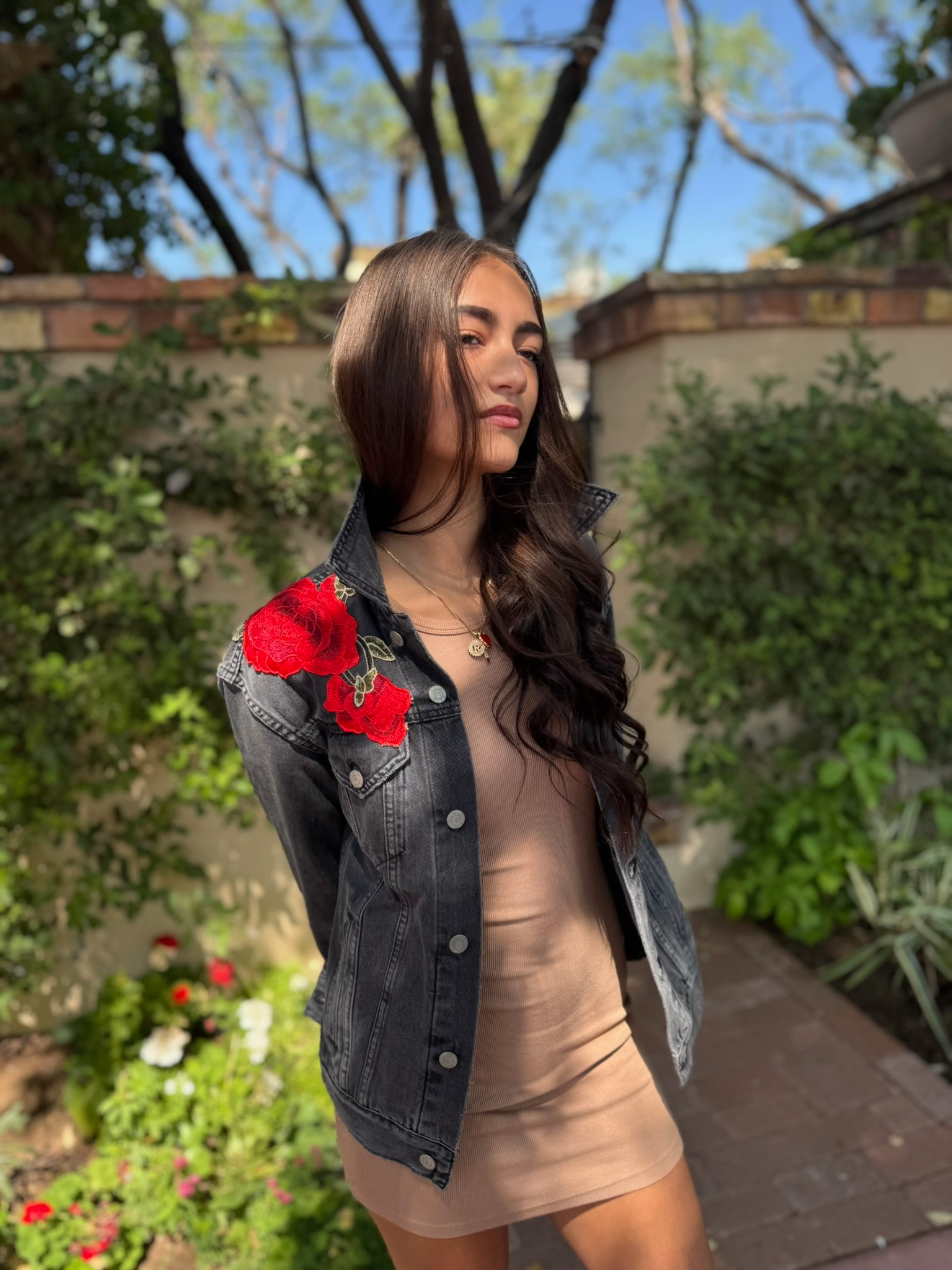 From work to play, this versatile denim jacket will make you feel like a chic Mama! Featuring a red flower patch and a large Mama patch on the back.
