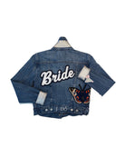 Ready To Wear Jacket for the Bride. This jacket features a Bride varsity patch on the back complimented by a butterfly patch on the side and other bride-inspired patches.