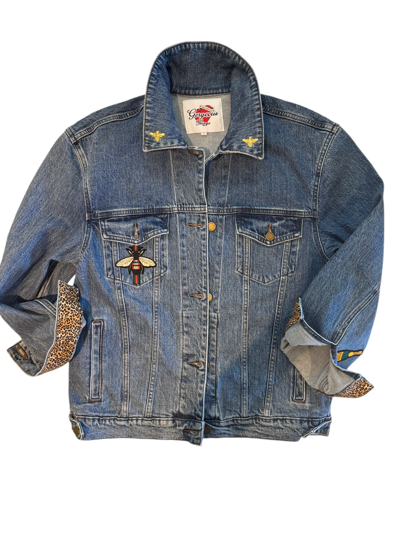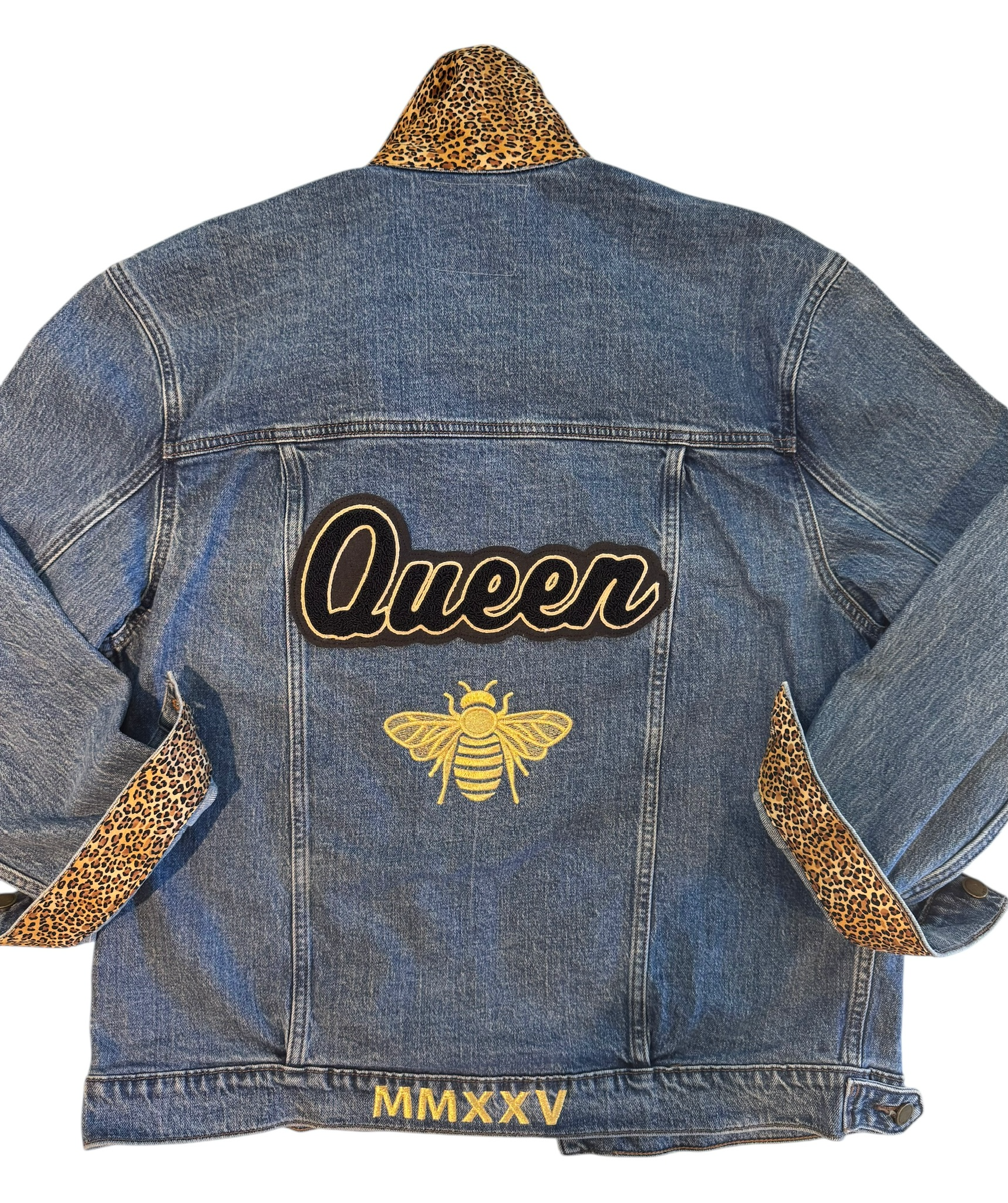 Ready-To-Wear Queen Bee Jacket featuring a Queen varsity patch on the back followed by a small bumblebee patch and leopard print collar & cuffs.