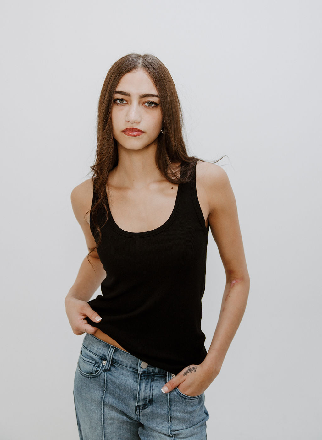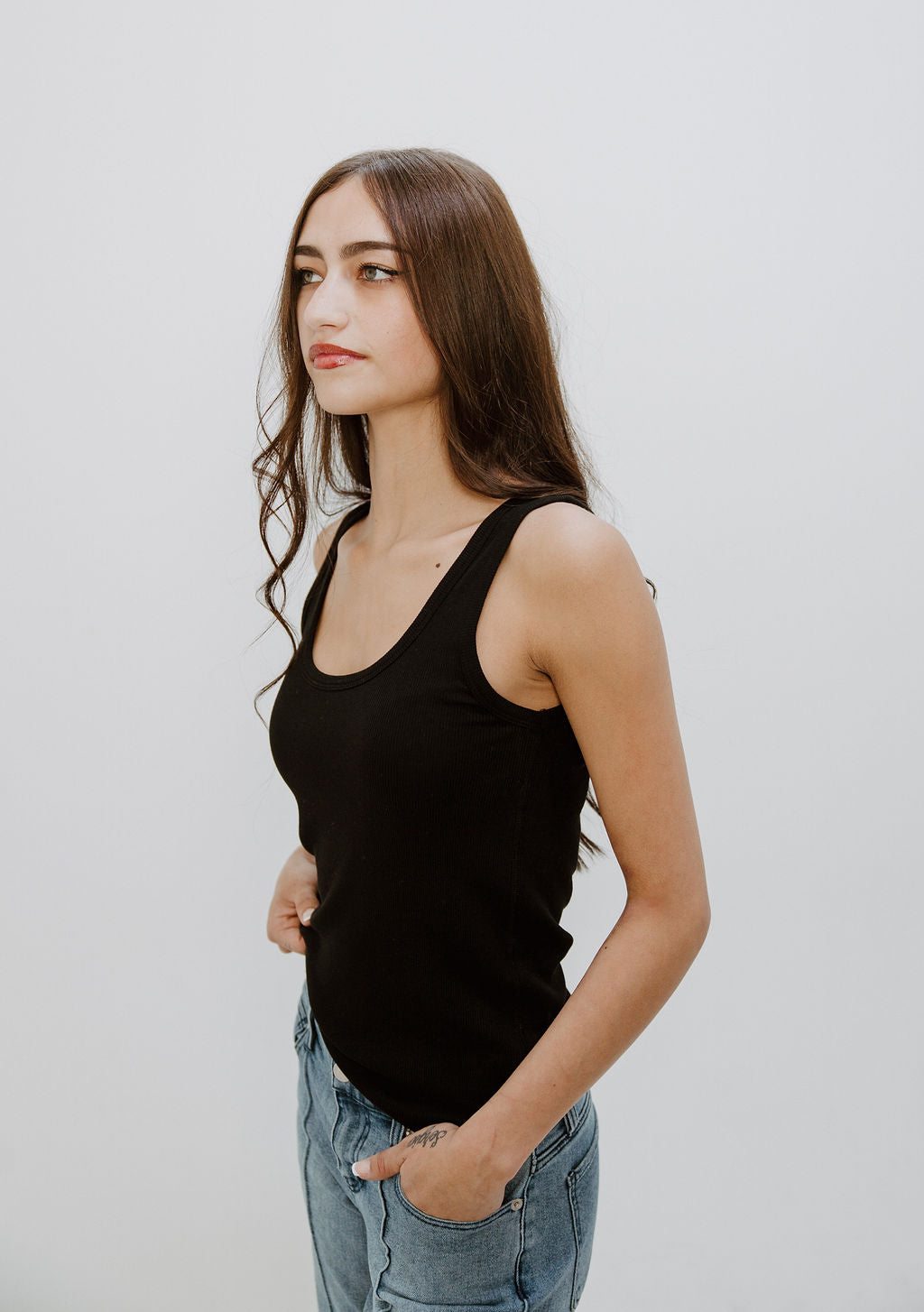 The ultimate layering piece, this short fitted tank is a foundational basic for every capsule wardrobe. Its modal spandex rib fabrication is figure flattering and soft-to-the-touch. Bra coverage with its shell back design.
