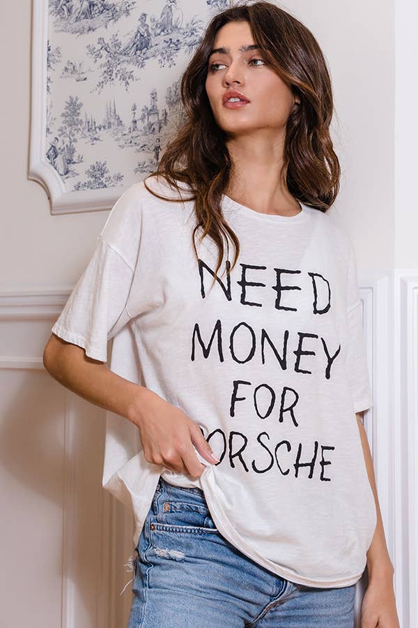 'NEED MONEY FOR PORSCHE' Print Graphic T-shirt Top - Crew neckline - Short sleeves