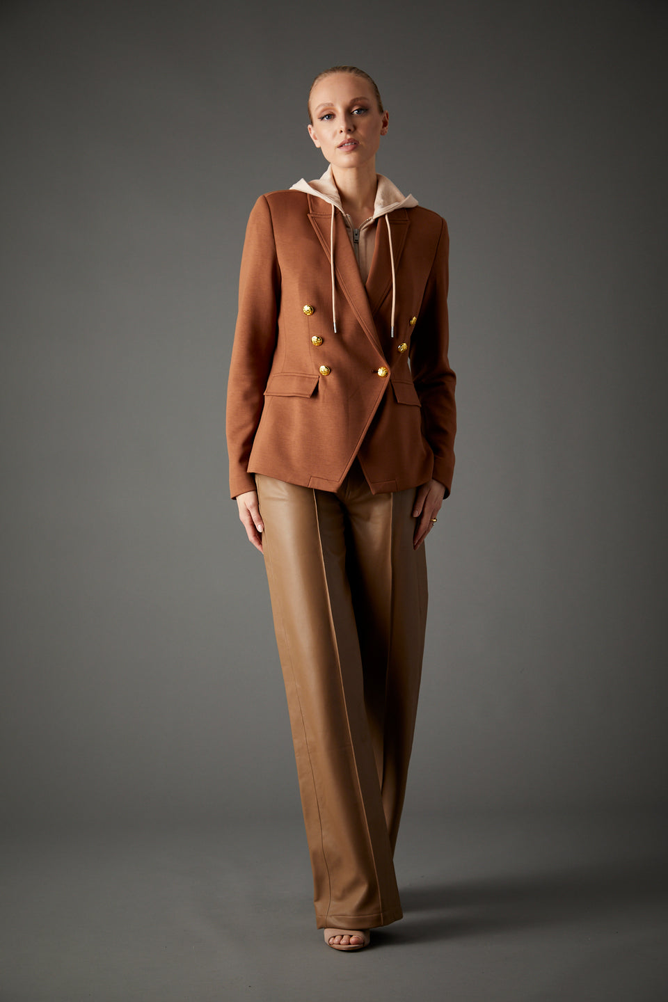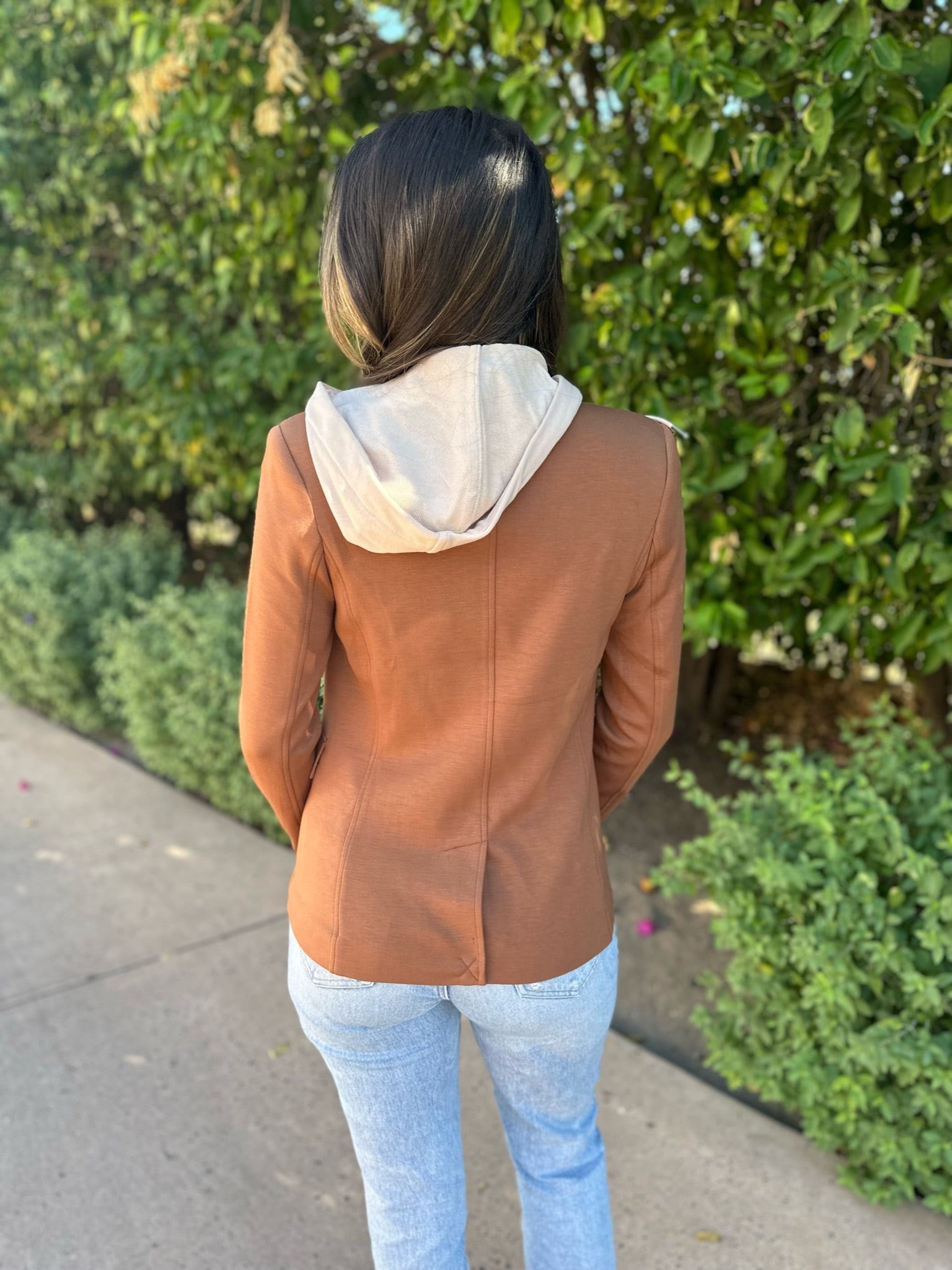 Our Helen Double Breasted Blazer is crafted in NEW lightweight stretch-suiting fabric and detailed with 2 closures. The Tan Hoodie insert easily zips out for twice the styling. This scuba fabric is so soft you'll want one in every color.