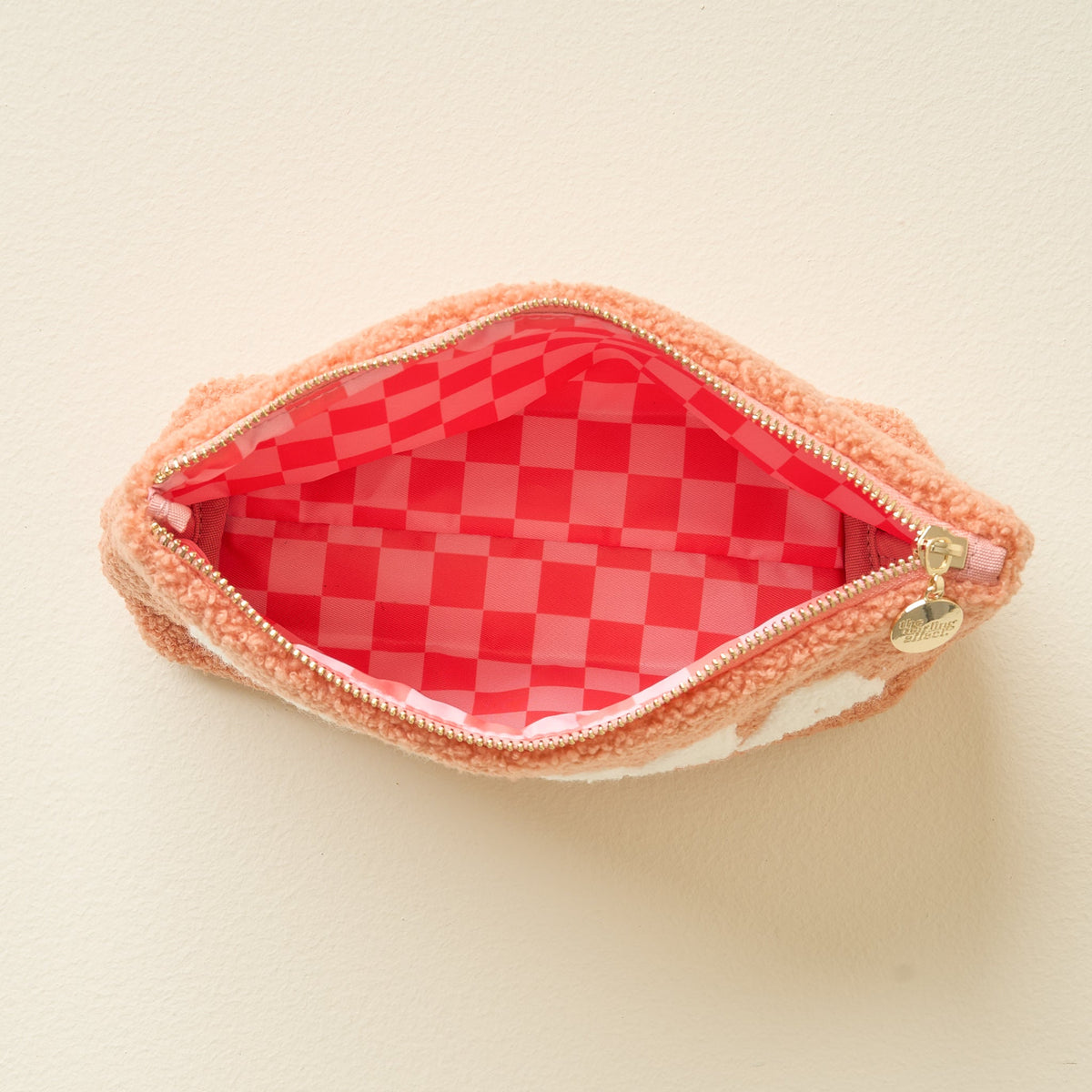 Add a cozy touch to your essentials with our Pink Bow teddy pouch. Crafted from soft sherpa fabric, this pouch features a wipeable lining for easy cleaning, and gold zippers and hardware for a polished look. The interior is lined with a fun printed fabric, making it as stylish on the inside as it is on the outside. A perfect size for keeping your favorite items organized, and can be beautifully paired with our other teddy pouch sizes to create a matching set.