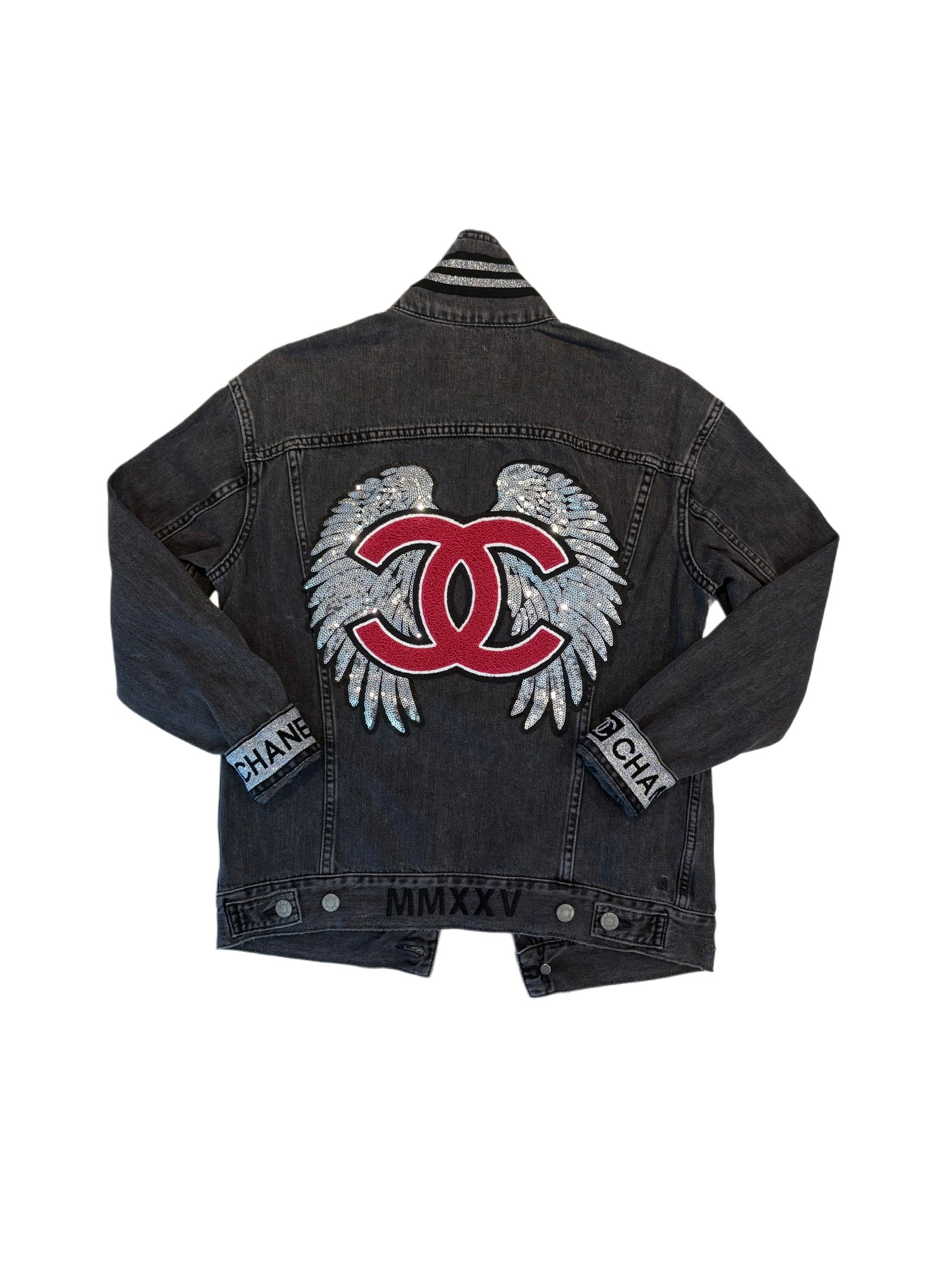 Ready To Wear Jacket featuring the classic Chanel CC logo mixed with angel wings and CHANEL ribbon around the cuffs.