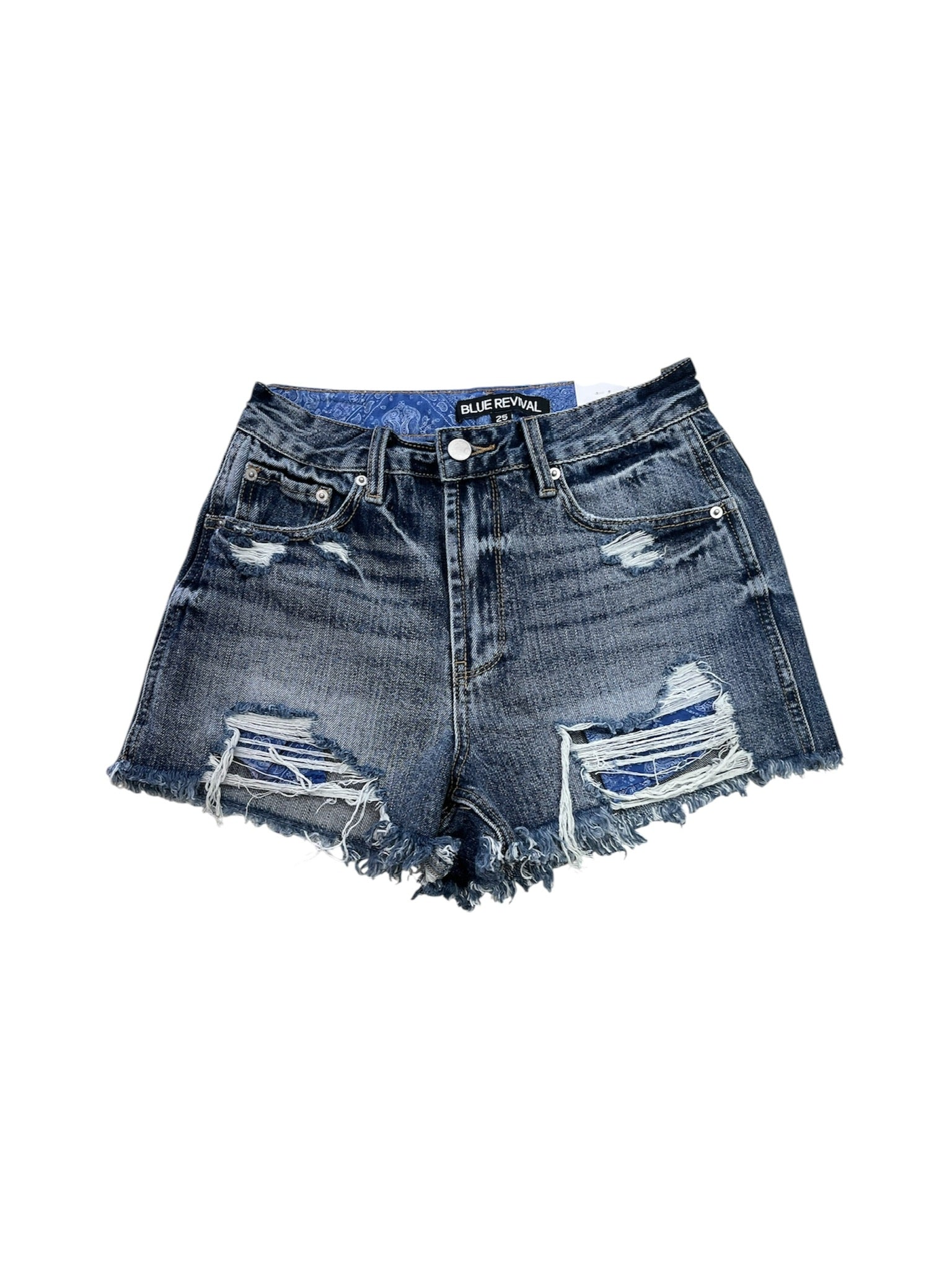 The Wild & Free high-waisted short detailed with black bandana pockets. This denim short features frayed hems with the classic 5 pocket style.